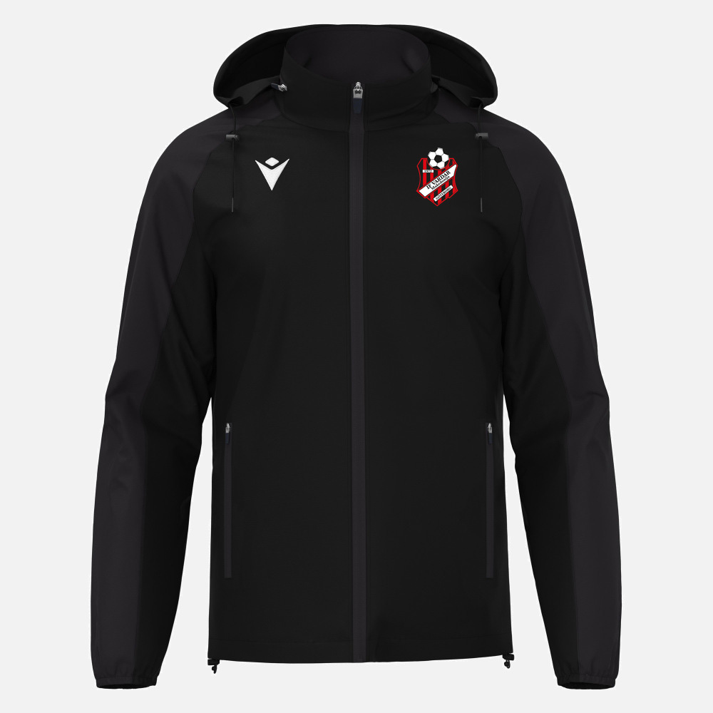 Jacka i vattenavvisande material med meshfoder, vattentät och andningsbar på samma gång. Dragkedja i nylon, med automatiskt låsande skjutreglage. Sidofickor med dragkedja. Huva i krage, elastiska muddar i ärmslut och dragsko i nederkant. Ton-i-ton-inslag på ärmarna.